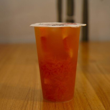 напиток на таро и молоке с добавлением персика, сгущенки, фирменного крема и большими шариками желе
